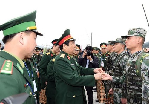 Hai Bộ trưởng Quốc phòng Việt - Trung thực hiện nghi lễ chào cột mốc chủ quyền 1223 Ảnh: Trọng Hải
